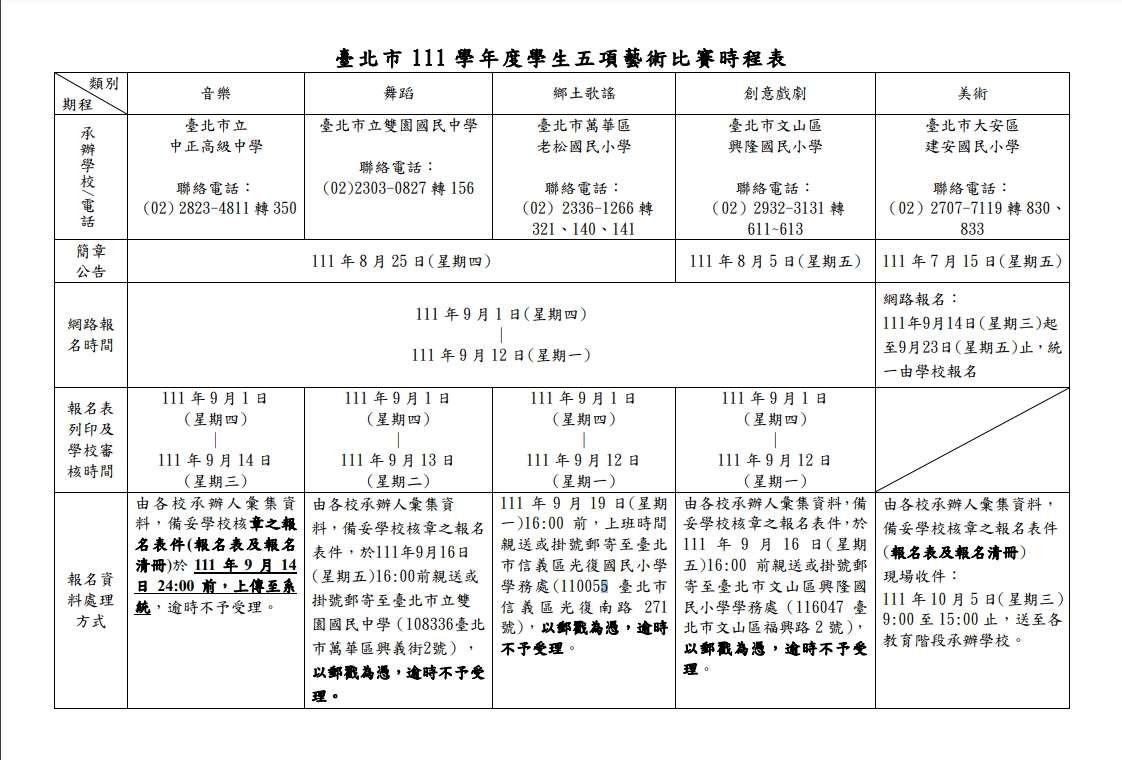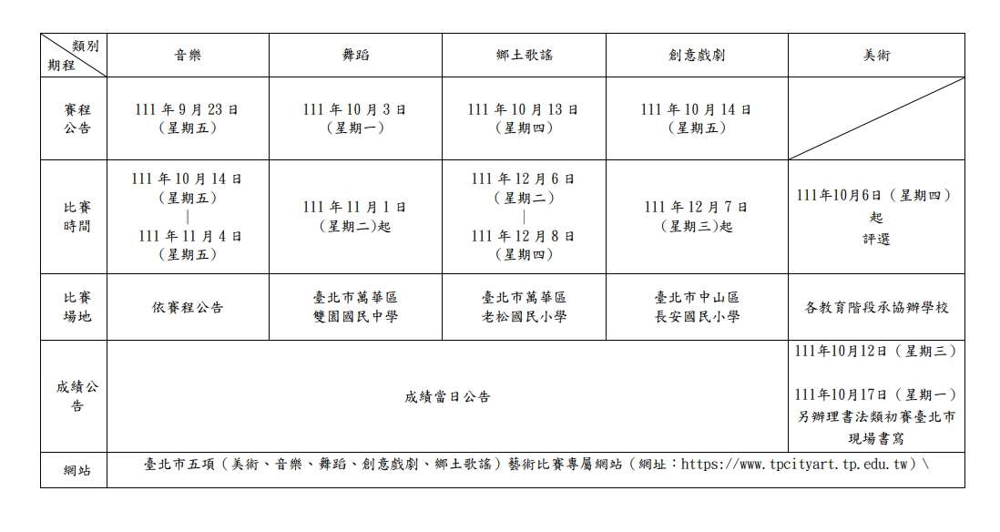 本市111學年度學生五項藝術比賽網站已公告,欲參加五項藝術比賽者,請自行參閱比賽官網。
