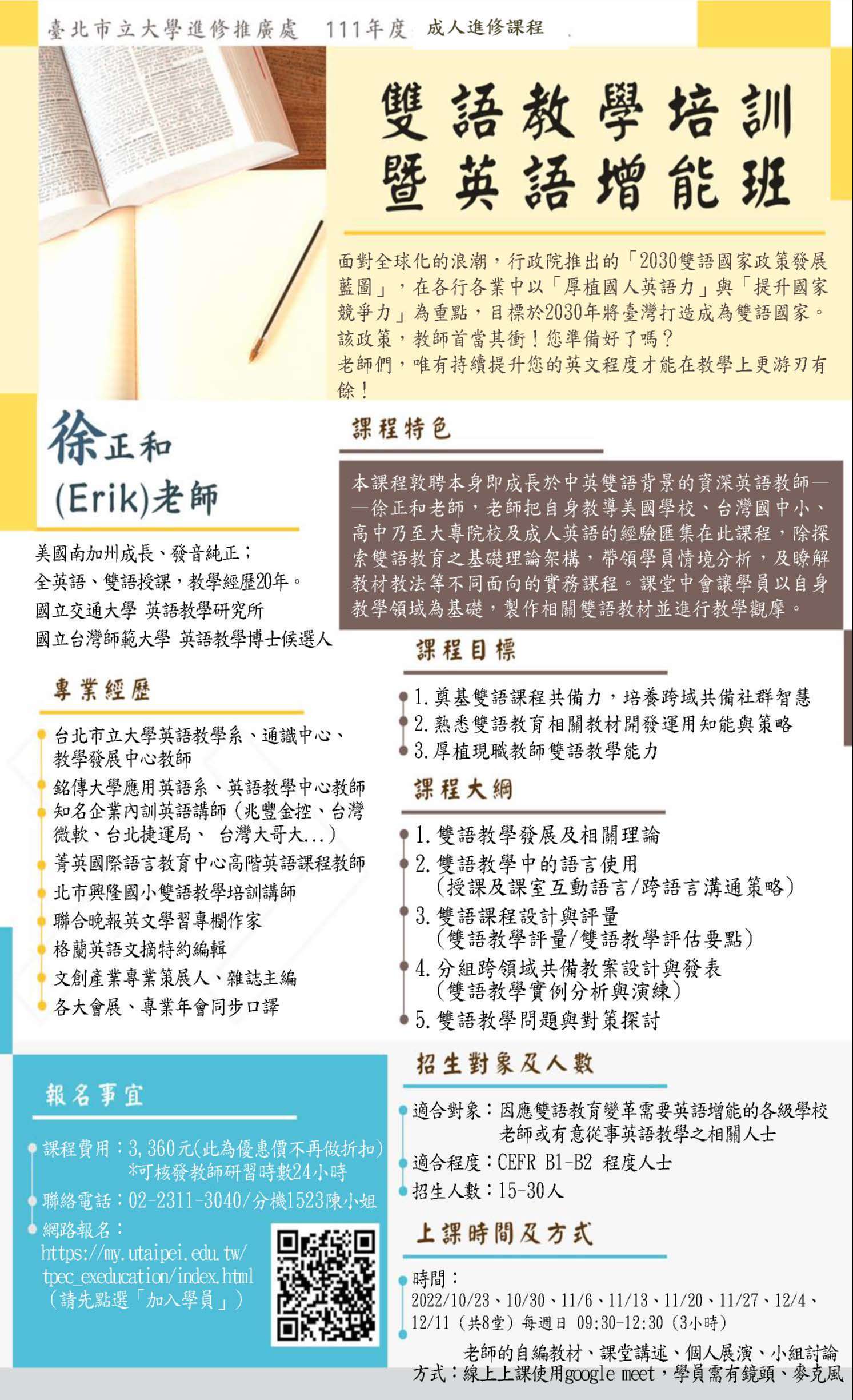 (七)網路報名:請至本處報名網頁報名(https://my. utaipei.edu.tw/tpec_exeducation/index.html)新學員 請先於右上角「加入學員」,再於左欄點選「111-1 成 人進修-線上雙語教學培訓暨英語增能班」。