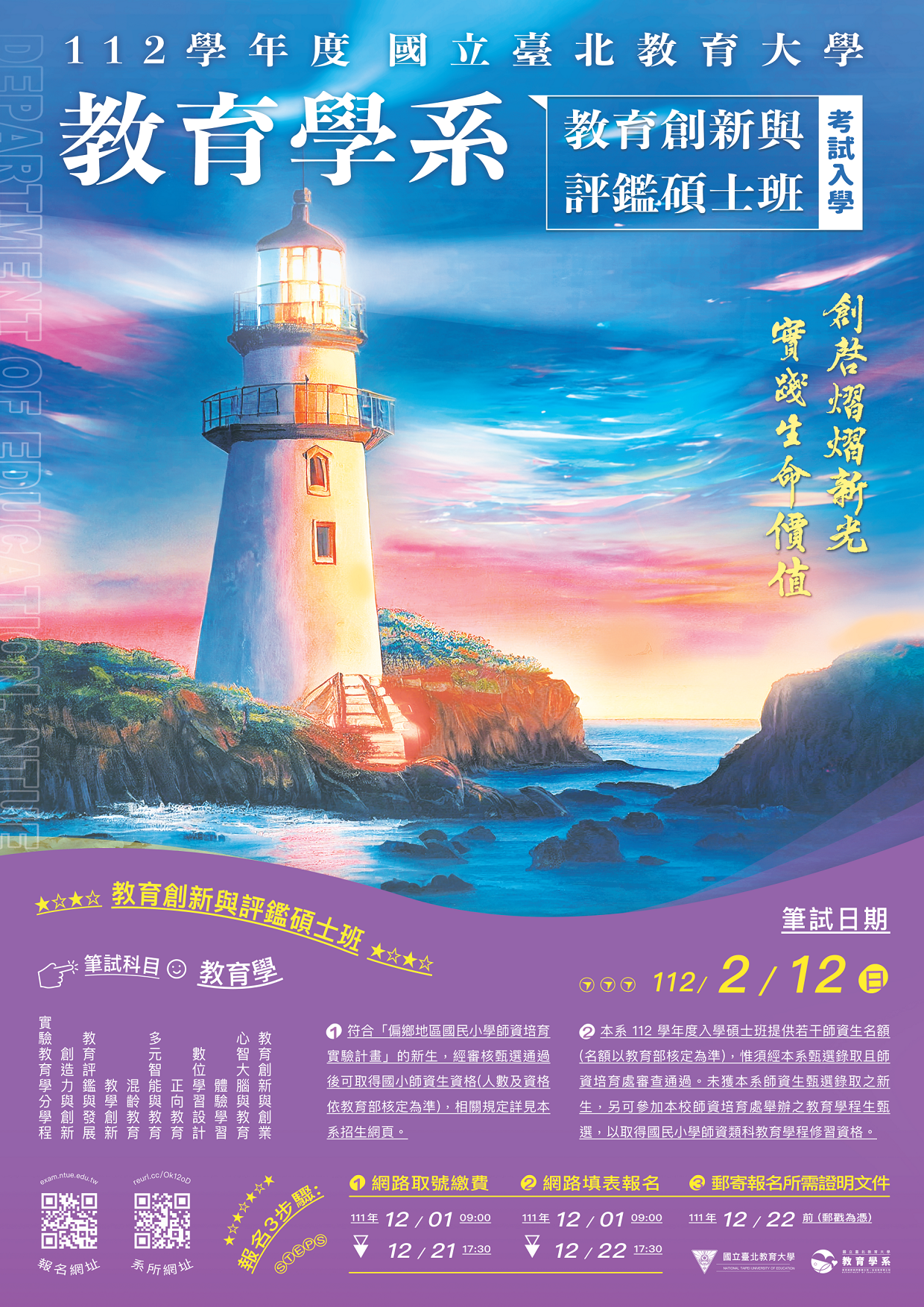 二、本系教育創新與評鑑碩士班考試入學筆試日期為112年2月 12日(星期日)。筆試科目:教育學。
