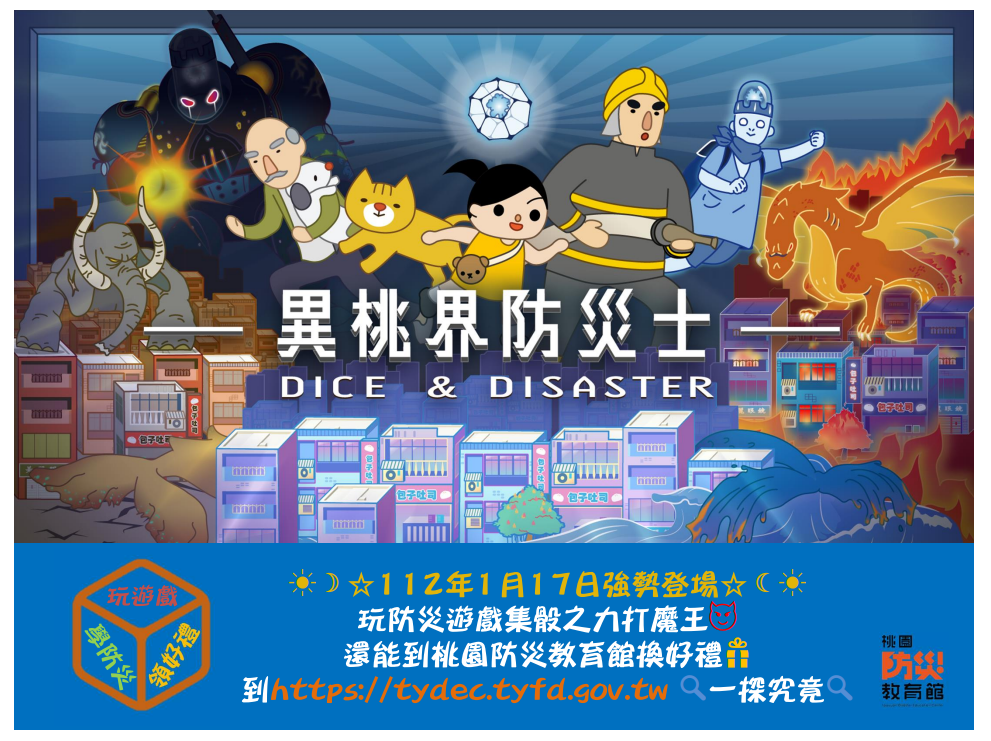 為使防災教育向下紮根並深入家庭,桃園市政府消防局近期完成虛擬桃園防災教育館-「異桃界防災士 (Dice&Disaster)」線上學習平臺供高級中等以下學校學 生使用,並訂於112年1月17日正式啟用。