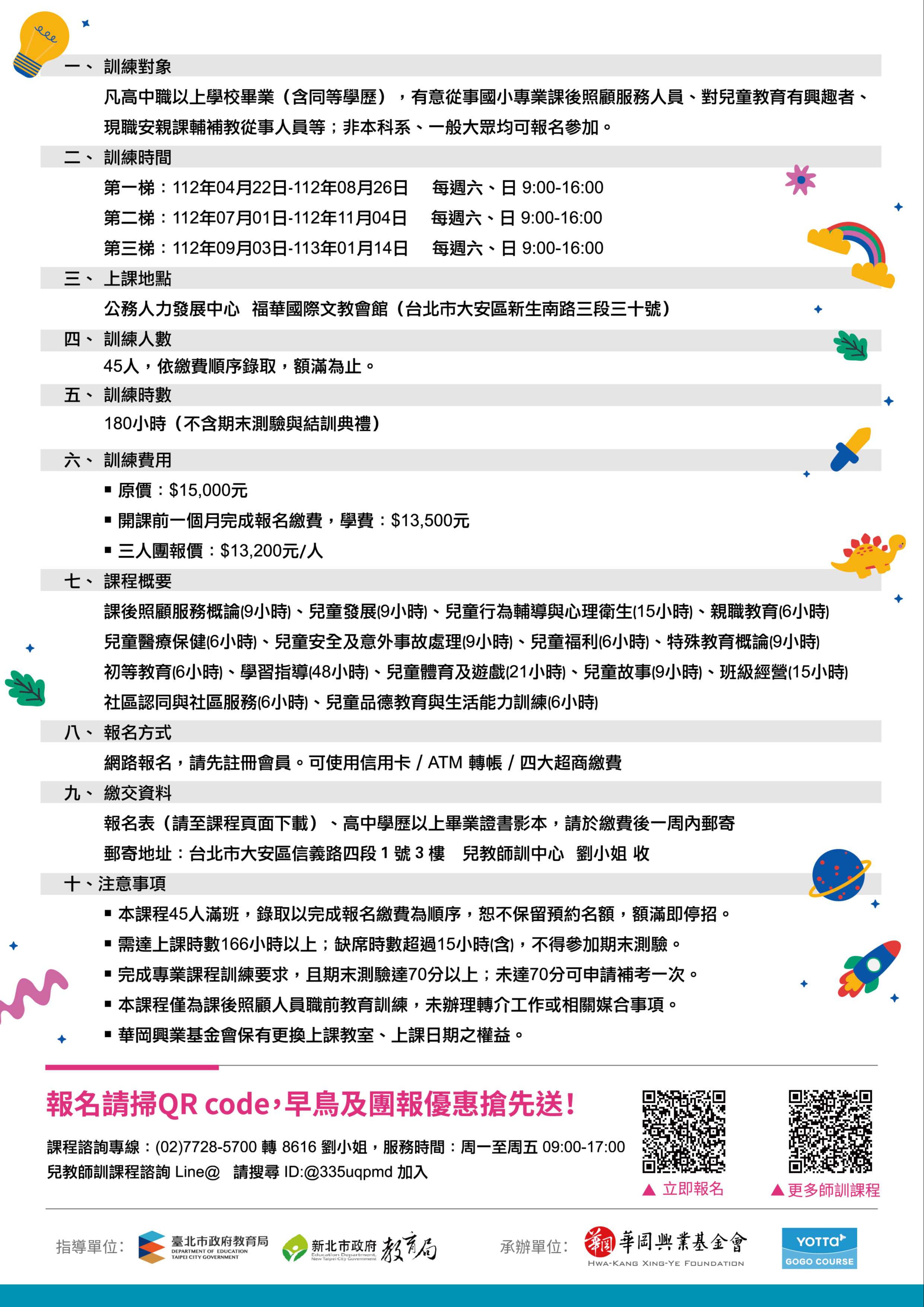 一、本訓練課程內容係依據教育局112年2月8日北市教終字第 1123016971號函核可之「兒童課後照顧服務人員職前訓練 課程執行計畫書」辦理。