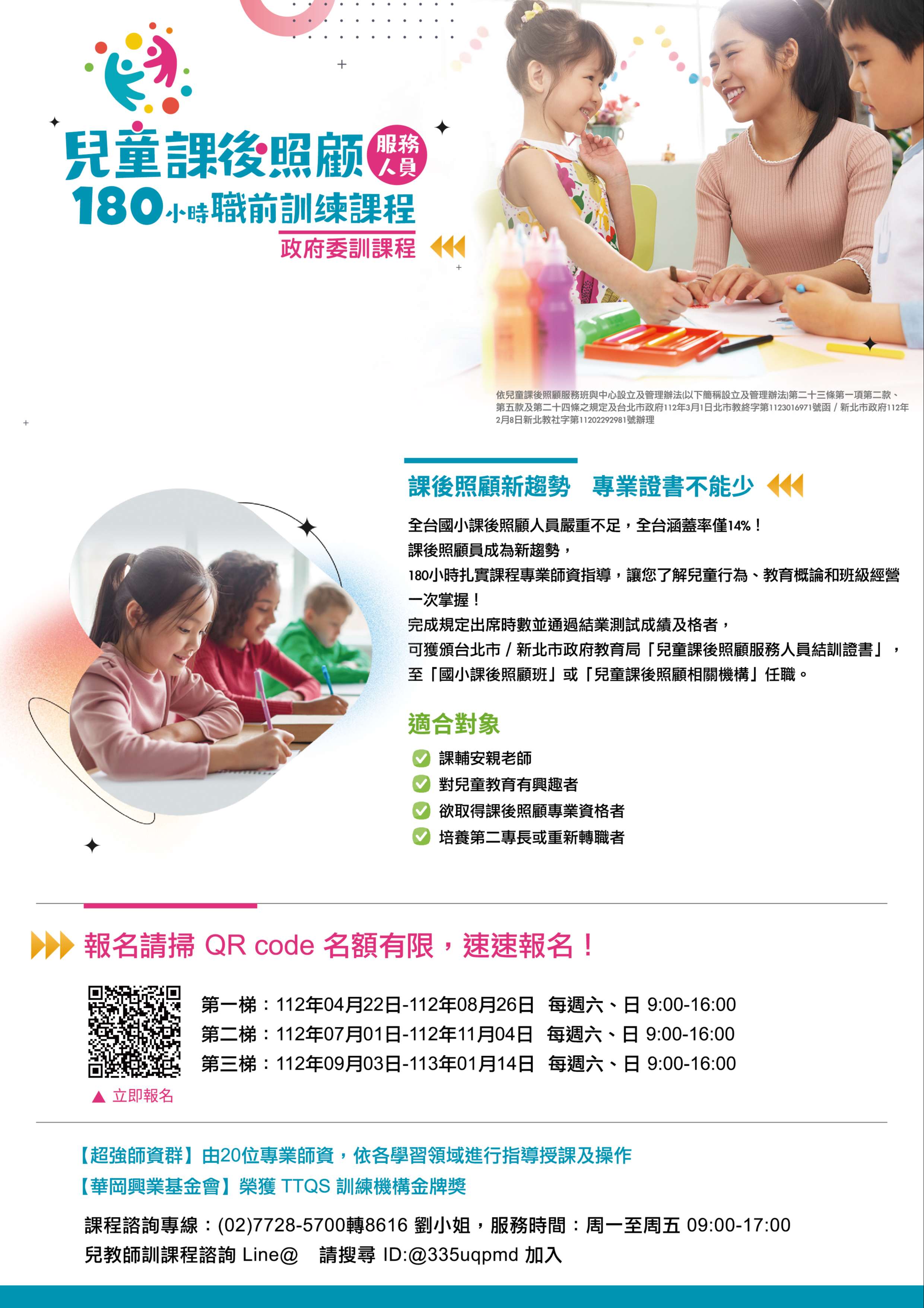 (一)招生對象:凡高中職(含)以上學校畢業,有意從事國 小專 業課後照顧服務人員並對兒童教育有興趣者或現職安親課輔補 教從業人員均可報名參加,依報名繳費順序錄取,額滿為止。 凡符合「兒童課後照顧服務班與中心設立及管理辦法」第23條 任一資格者,毋須報名此課程。