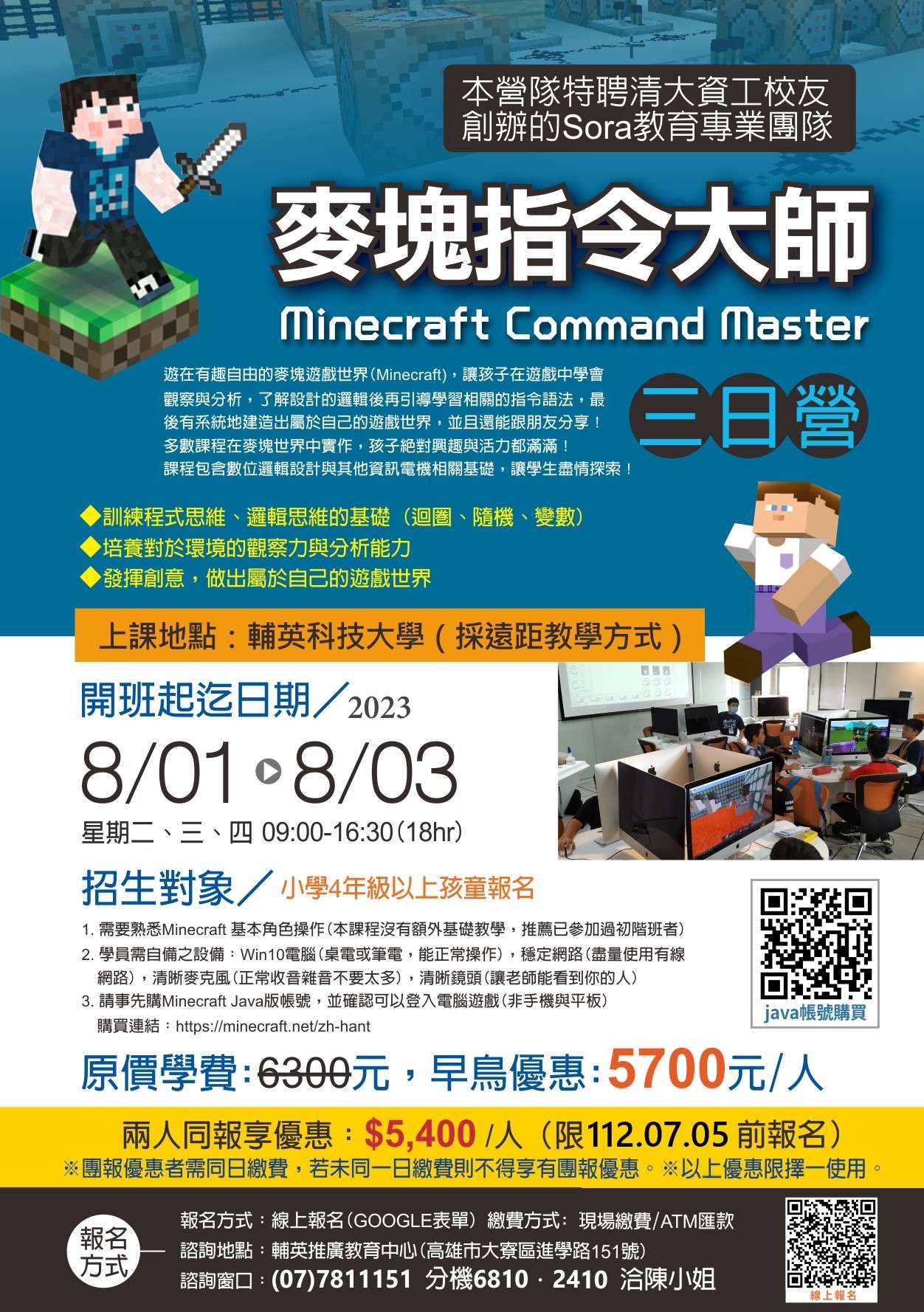 二、小學4年級以上孩童報名,需要熟悉 Minecraft 基本角色操作(本課程沒有額外基礎教學,推薦已參加過初階班者)。