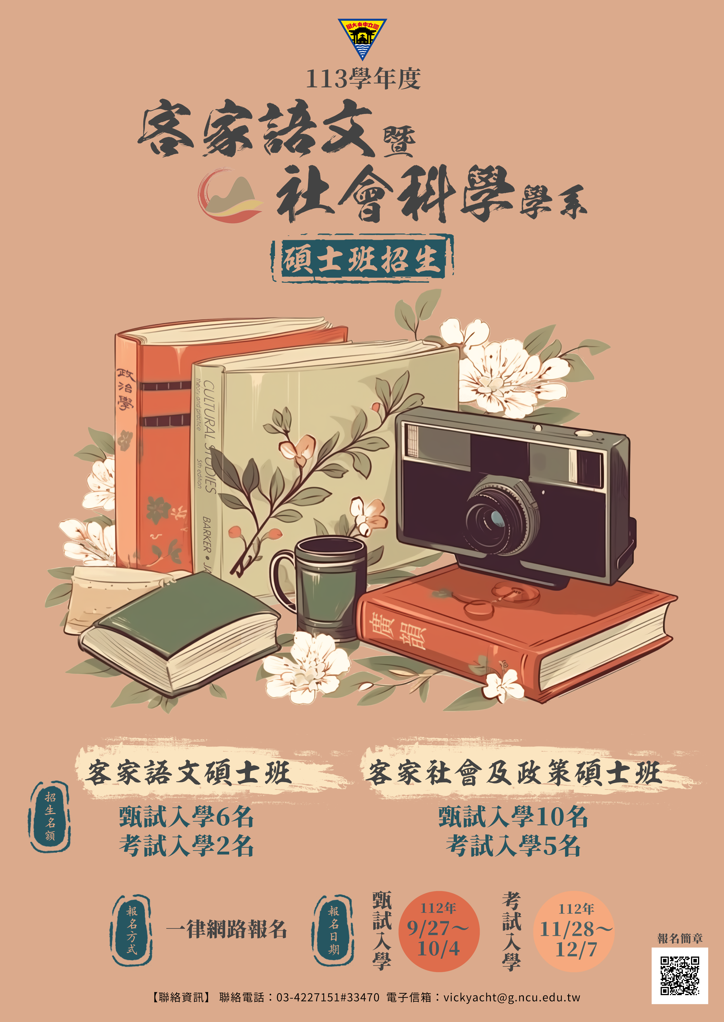 一、本校客家語文暨社會科學學系「客家社會及政策碩士 班」、「客家語文碩士班」113學年度招生,分為甄試及考 試入學兩種方式,並一律網路報名。