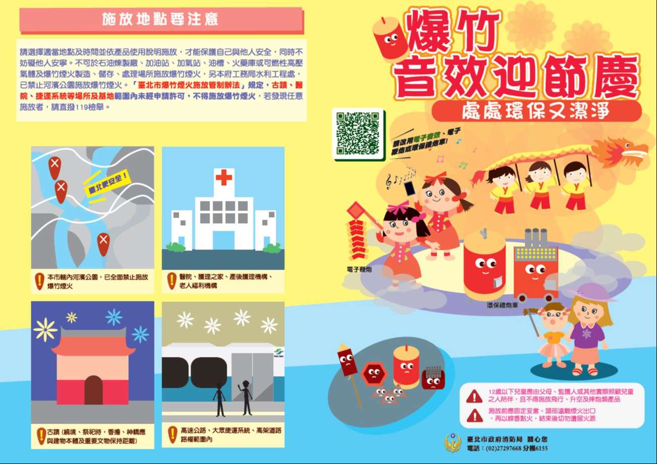 (二)購買爆竹煙火應選購合格的產品,並了解產品種類屬性後,依使用說明進行燃放;建議以爆竹音效(本府消防網站下載https://reurl.cc/pr3W0d),取代傳統爆竹煙火施放,可確保環境安全及潔淨。