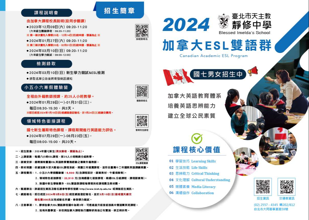 一、為使家長與學生充分了解國中部加拿大雙語課程、全人菁英課程之入學資訊,舉辦招生說明會,如下列: