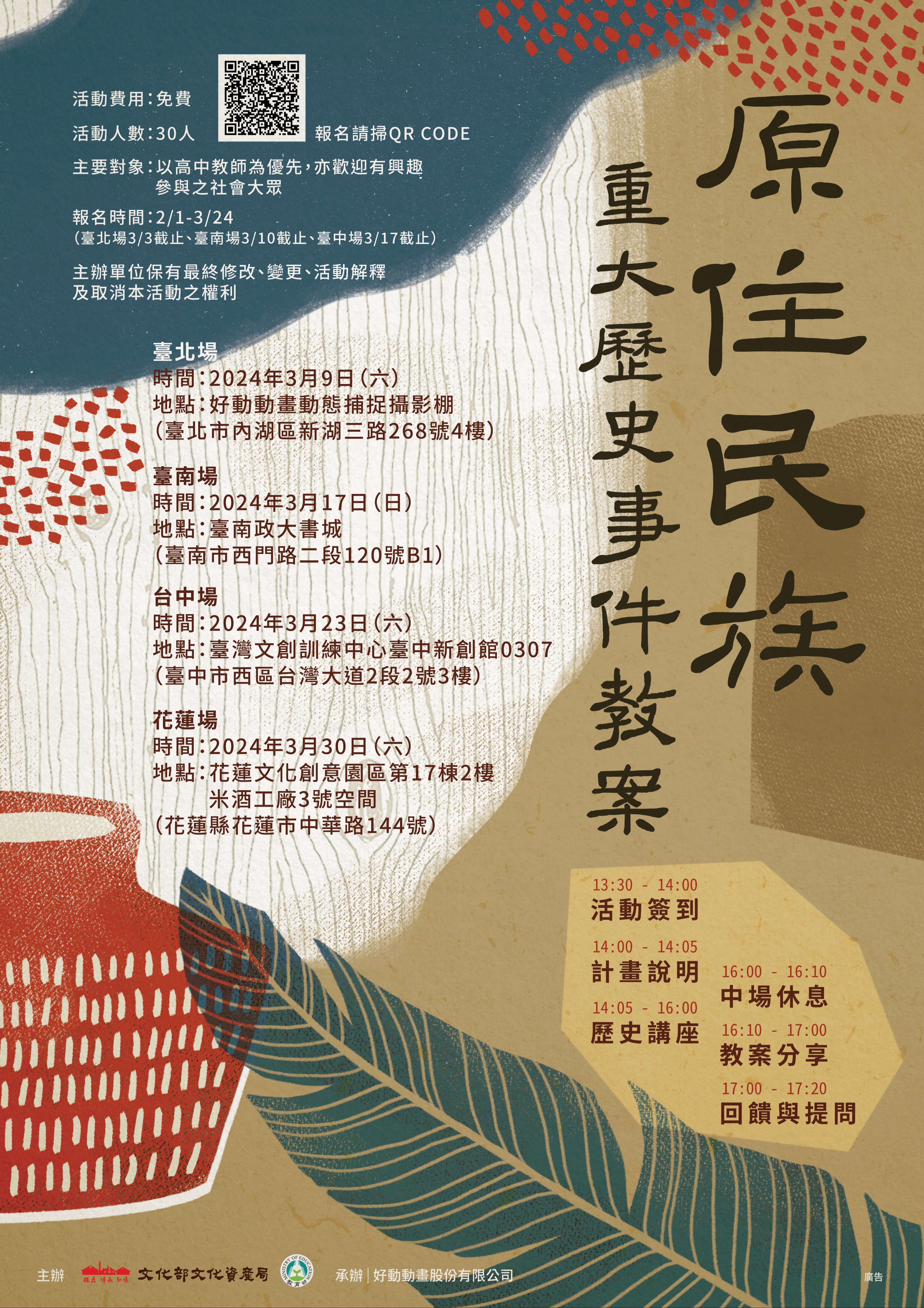 三、活動資訊: (一)臺北場:113年3月9日(星期六)好動動畫動態捕捉攝影 棚(臺北市內湖區新湖三路268號4樓)。(二)臺南場:113年3月17日(星期日)臺南政大書城(臺南 市西門路二段120號B1)。 (三)臺中場:113年3月23日(星期六)臺灣文創訓練中心臺 中新創館0307空間(臺中市西區臺灣大道二段2號3 樓)。 (四)花蓮場:113年3月30日(星期六)花蓮文化創意園區第 17 棟2樓米酒工廠3號空間(花蓮縣花蓮市中華路144 號)。