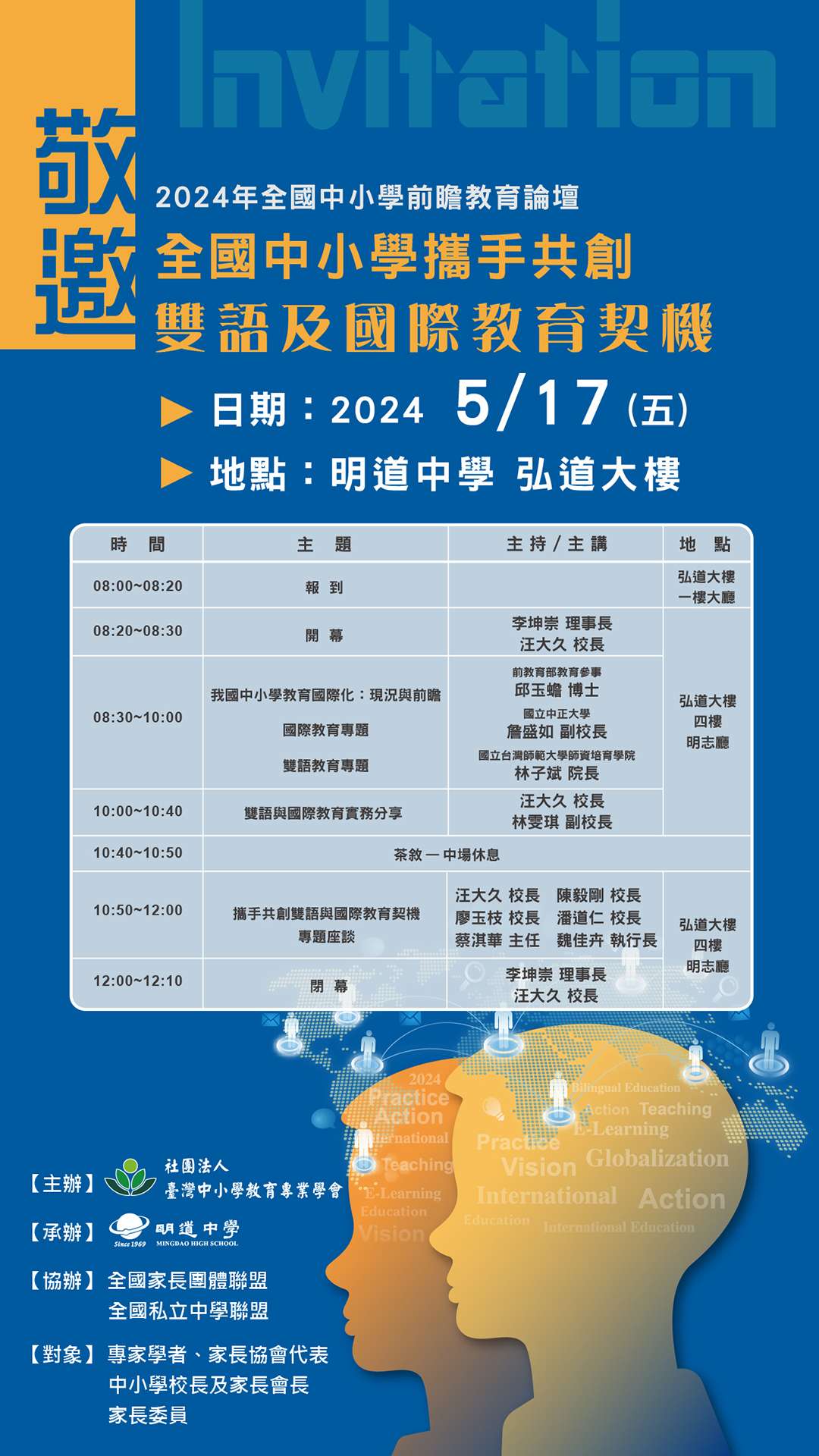五、辦理單位: (一)主辦:社團法人臺灣中小學教育專業學會 (二)承辦:明道中學(三)協辦:全國家長團體聯盟、全國私立中學聯盟