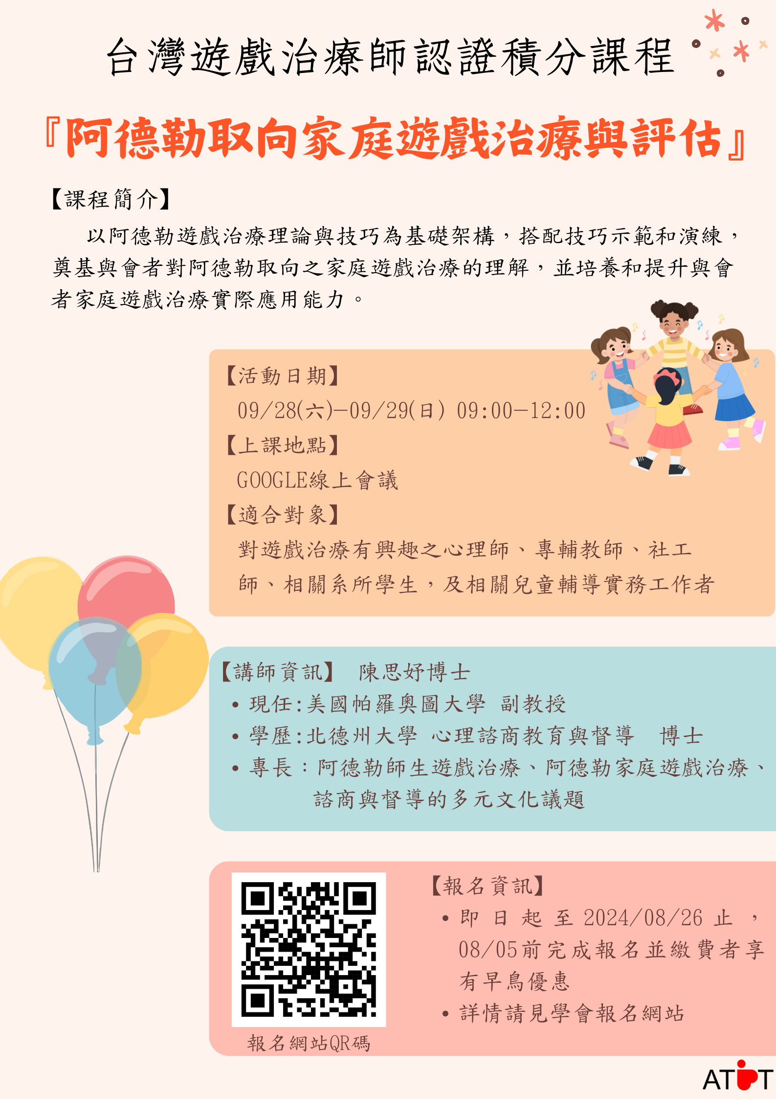 【2024台灣遊戲治療師認證積分課程】阿德勒取向家庭遊戲治療與評估,課程時間及講師資訊。