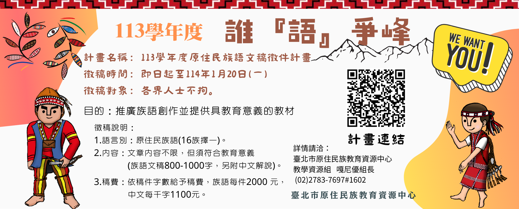 二、活動資訊如下: (一)徵稿日期:即日至114年1月20日止。 (二)徵稿對象:各界人士不拘。 (三)報名方式:參賽作品及報名資料請E-mail電子檔至 tpiercenter@mail.thes.tp.edu.tw,接獲電子郵件確認 後即完成參加程序。 (四)徵稿說明: 1、語言別:原住民族語(16族擇一)。 2、內容:文章內容不限,但須符合教育意義(族語文稿 800-1000字,另附中文解說)。