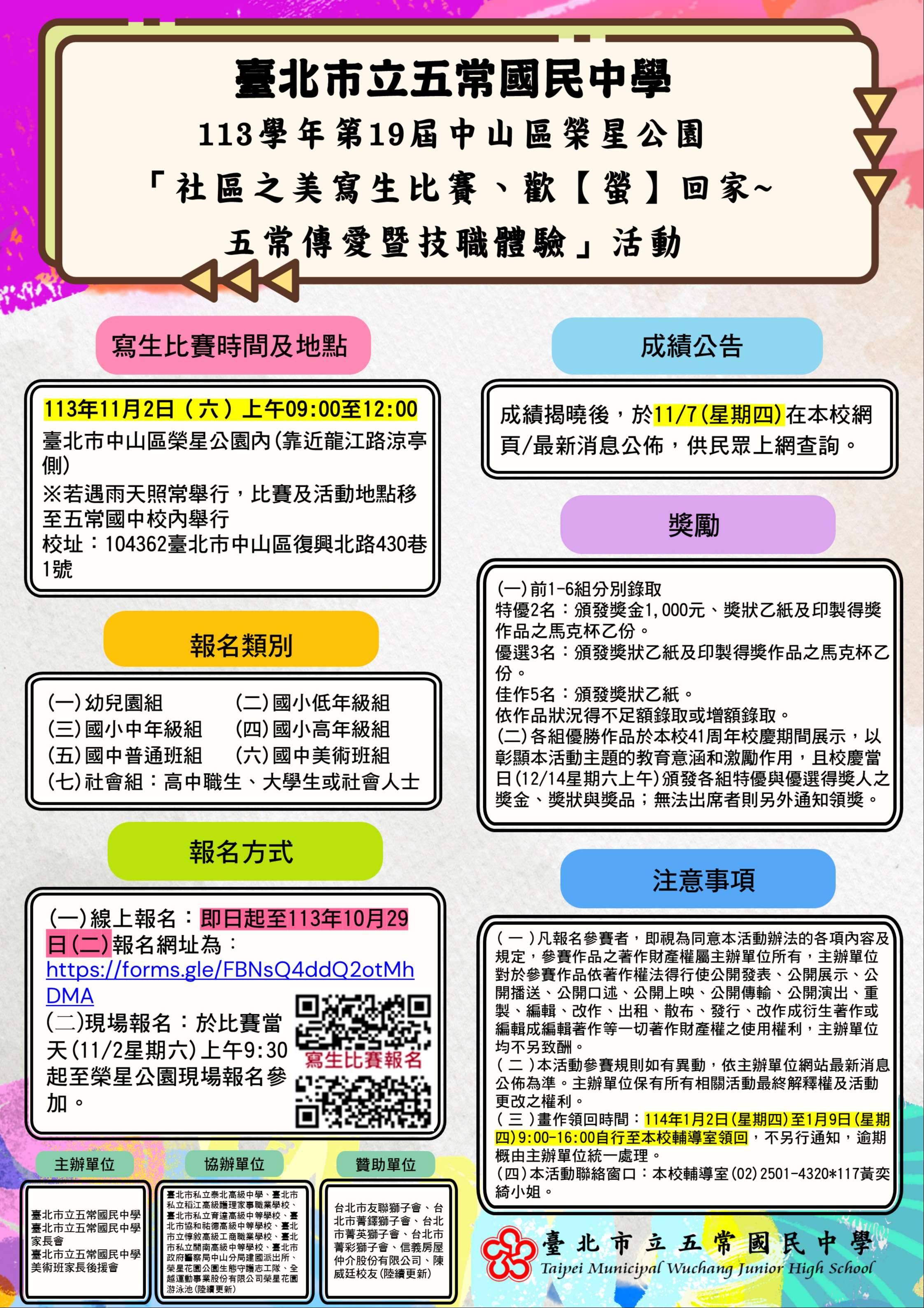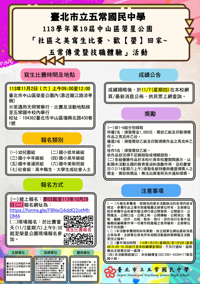 一、比賽時間:113年11月2日(星期六)早上9時至12時整。比賽地點:榮星公園內(臺北市中山區民權東路三段與 龍江路口),若遇雨天照常舉行,比賽地點移至五常國 中校內。