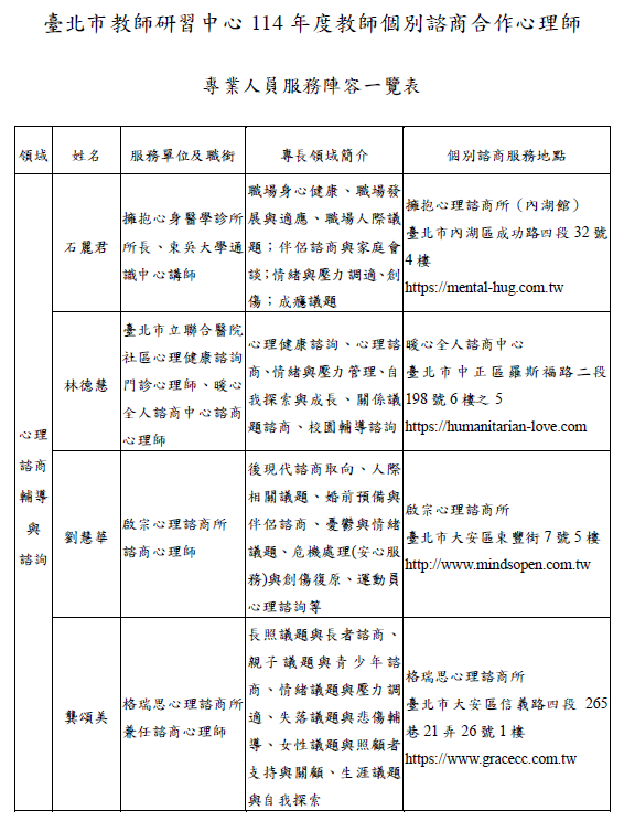 相關內容,請參閱中心官網「教師諮商輔導支 持服務」項下「專業諮詢、個別諮商輔導」網頁,網址 https://reurl.cc/d1ZNp2,或電洽本中心教師諮詢服務專 線02-28616629。