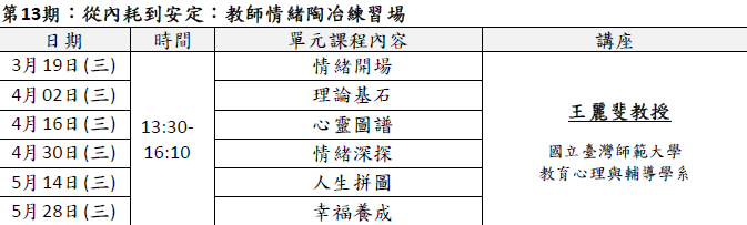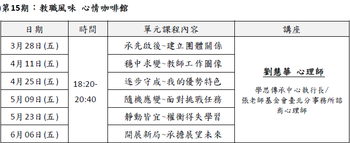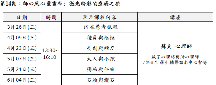 上課日期: (一)第13期:114年3月19;4月2、16、30日;5月14、28日 (週三、下午1:30-4:10)。 (二)第14期:114年3月26日;4月9、23日;5月7、21日;6月 6日(週三、下午1:30-4:10)。 (三)第15期:114年3月28日;4月11、25日;5月9、23日;6 月6日(週五、晚上6:20-8:40)。 五、上課地點: (一)第13期:臺北市和平實驗國民小學。 (二)第14、15期:臺北市立中山國民中學。