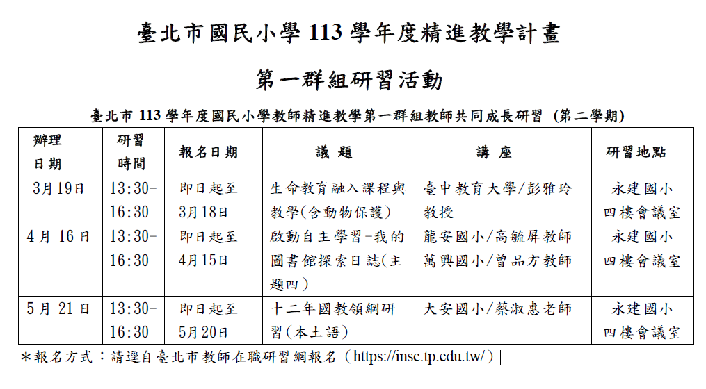 三、報名方式:請逕自臺北市教師在職研習網報名 (https://insc.tp.edu.tw/)。每場次全程參與者核予3小時研習時數。