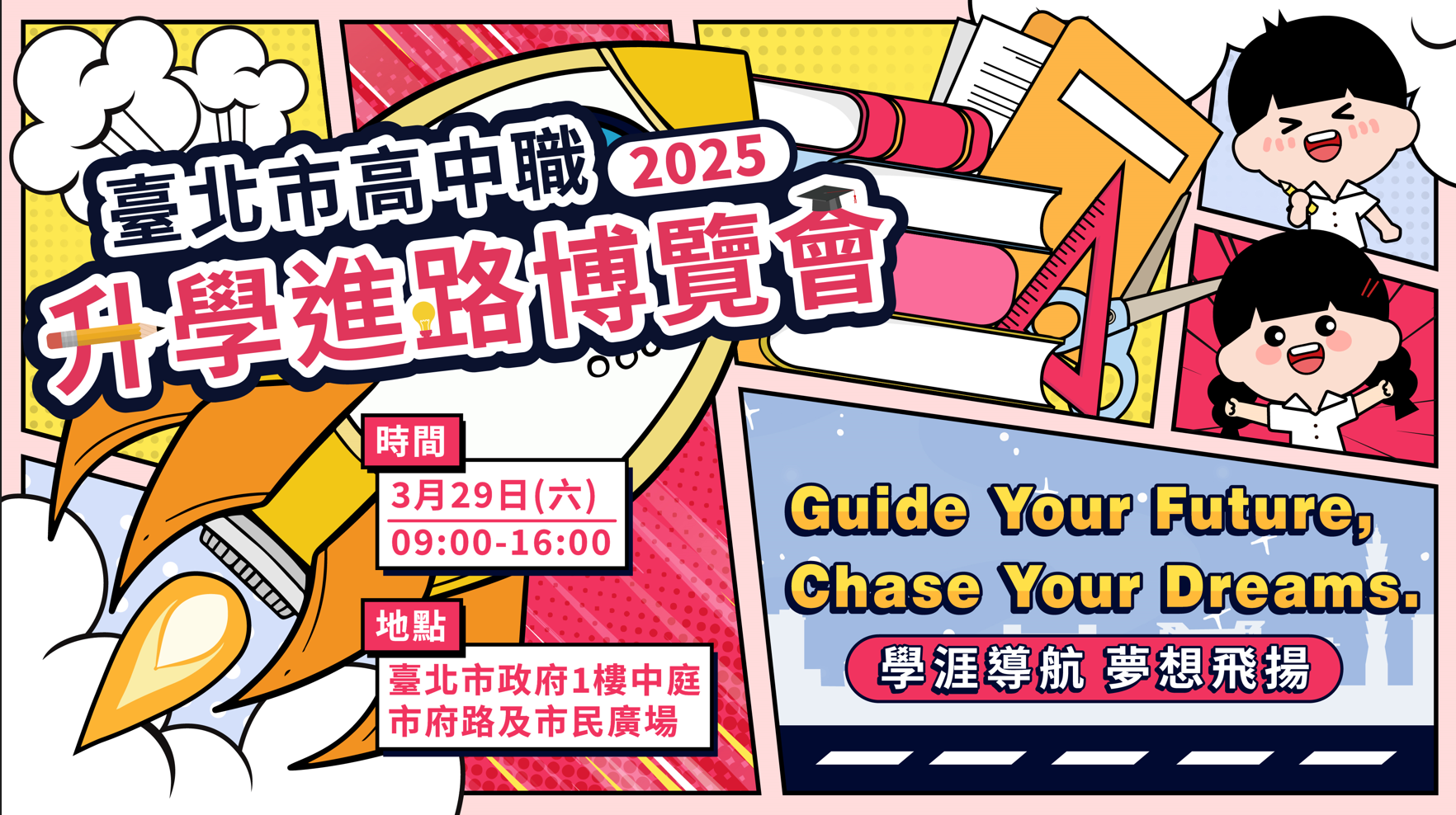 檢附臺北市2025年高中職升學進路博覽會宣傳海報,歡迎北北基桃國高中學生及家長來 現場參加,瞭解臺北市優質高中職學校特色,詳情可參考 本活動官方網站:https://sites.google.com/ymsh.tp. edu.tw/2025expo/。