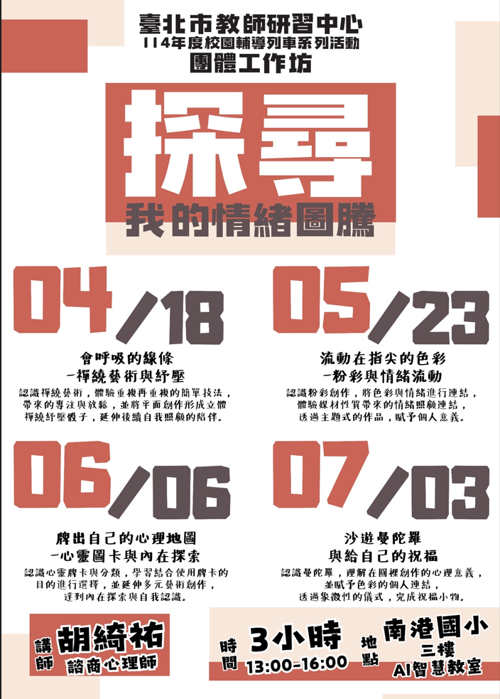 一、依據本市教師研習中心114年2月17日北市師輔字第 1446000430號函及本校申辦計畫辦理。