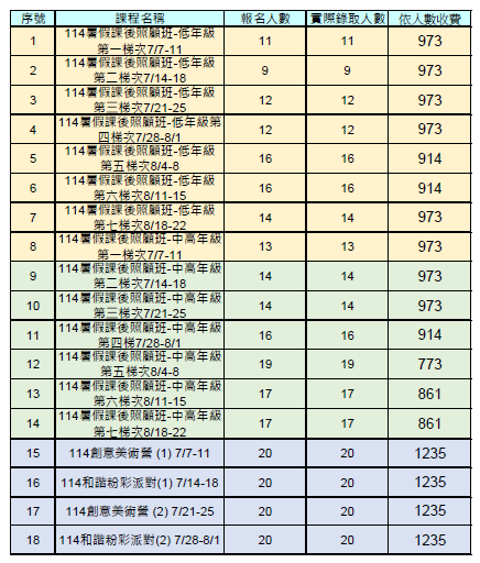 18個班別皆有順利開班,各梯次依報名人數收費如附表(不會再更動)