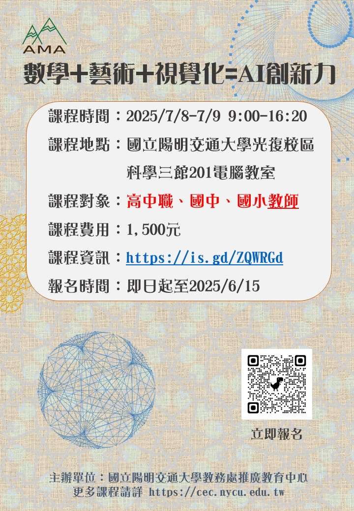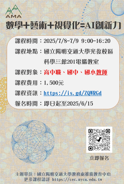 二、課程資訊如下: (一)課程日期:114年7月8日(二)至7月9日(三)。 (二)課程時間:09:00─16:20。 (三)課程地點:國立陽明交通大學新竹光復校區。 (四)課程對象:具PowerPoint能力的高中職、國中小教師。(五)課程費用:1,500元。 (六)課程內容:https://is.gd/ZQWRGd。 (七)報名日期:即日起至114年6月15日。 (八)全程參與課程可登錄教師研習時數12小時。