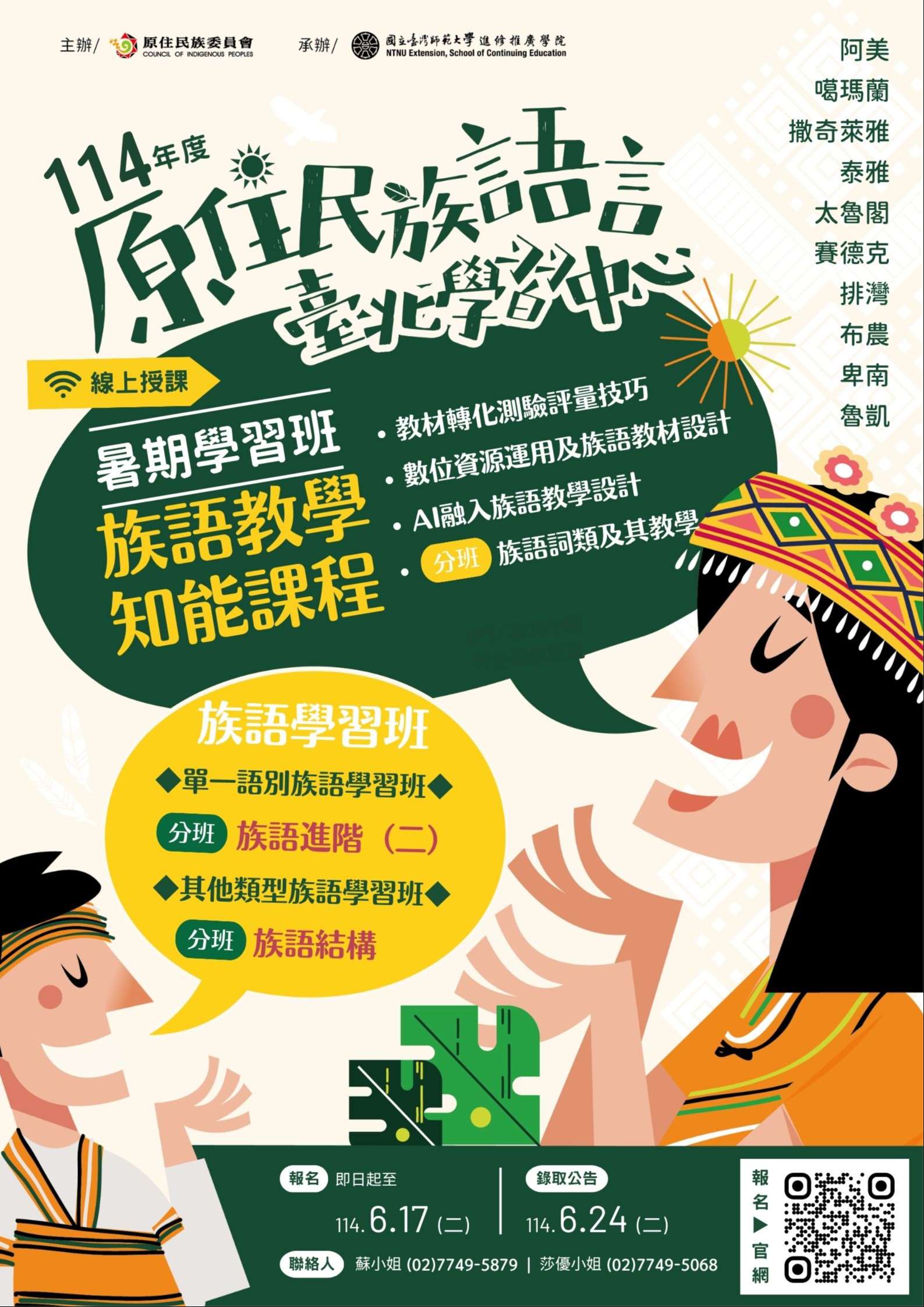 二、為協助強化原住民族語言師資教學專業知能,期有效提升 原住民族語言教學質與量,並強化族語傳承與發展之深度 與廣度,國立臺灣師範大學於114年度持續辦理旨揭專 班。
