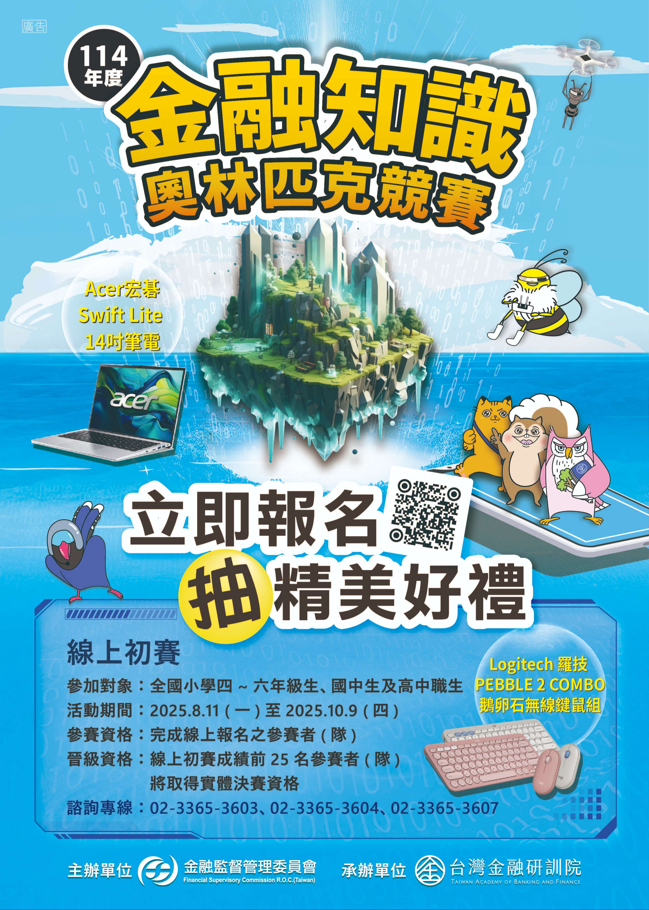 (一)國中及高中職組競賽: 1、參加對象:全國國中、高中職一至三年級學生。 2、線上初 賽期間:114年8月11日至10月9日。 3、活動方式:分為國中個 人組、國中團體組、高中 職個人組、高中職團體組,線上初賽 後擇優進入 實體決賽。