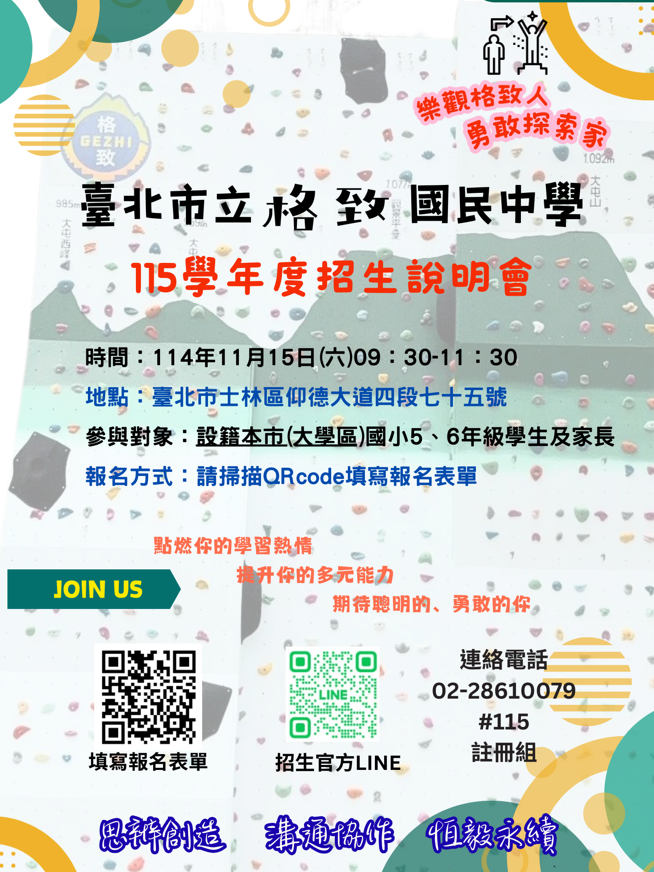 三、旨揭招生說明會資訊如下: (一)參加對象:國小五、六年級應屆畢業生及家長。 (二)時間:114年11月15日(星期六)上午9時至11時30分。 (三)地點:本校行政大樓2樓視聽中心(臺北市士林區仰德大 道4段75號)。