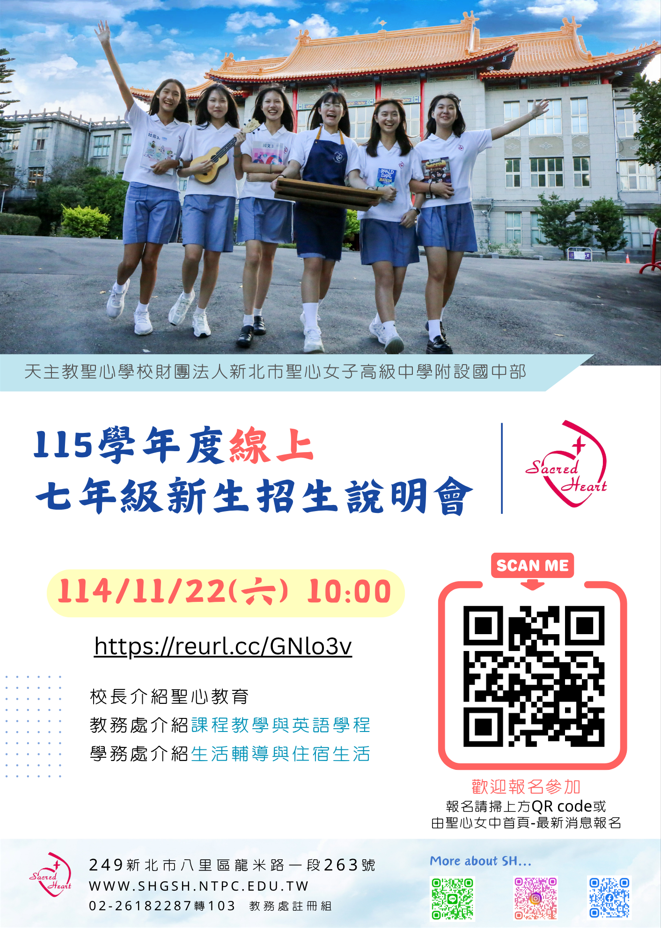 四、報名方式: (一) 報名表連結:https://reurl.cc/GNlo3v (二) 聖心女中首頁www.shgsh.ntpc.edu.tw—最新消息--115 學年度七年級新生線上招生說明會