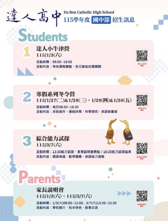 (一) 活動日期: 1、新生家長說明會:2026年1月3日(星期六)09:00至 11:00。 2、達人小牛津營:2026年1月3日(星期六)09:00至16: 00。