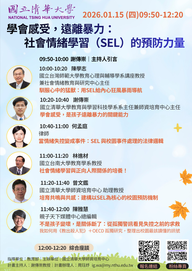 二、國立清華大學師資培育中心訂於115年1月15日上午9時50分 至12時20分辦理線上論壇。